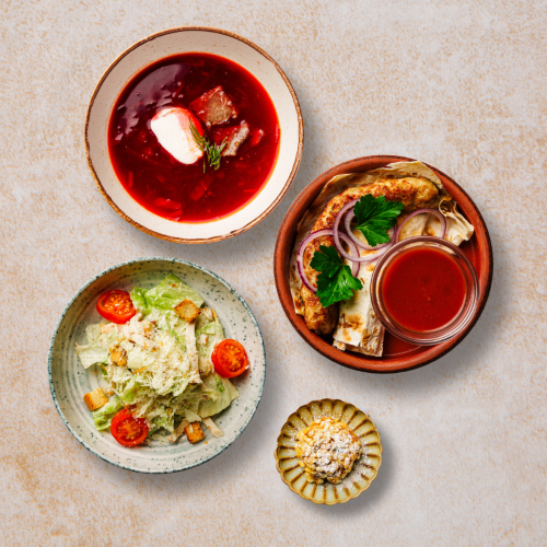 Суп борщ 839ккал, люля-кебаб с курицей 300ккал, салат цезарь с курицей 135ккал, чак-чак 161ккал, грузинский хлеб Шоти 279ккал